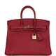 This Birkin is in Rubis togo leather with gold hardware, tonal stitching, front flap with two straps, front toggle closure, clochette with lock and two keys, and double rolled handles.