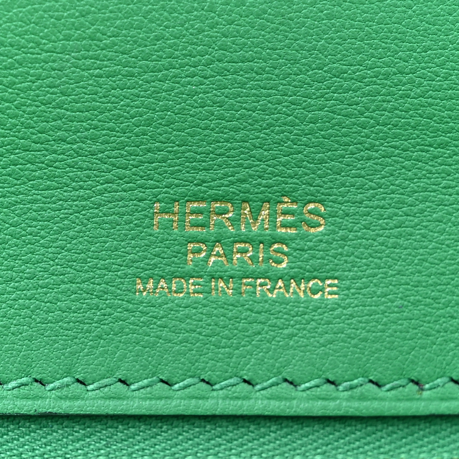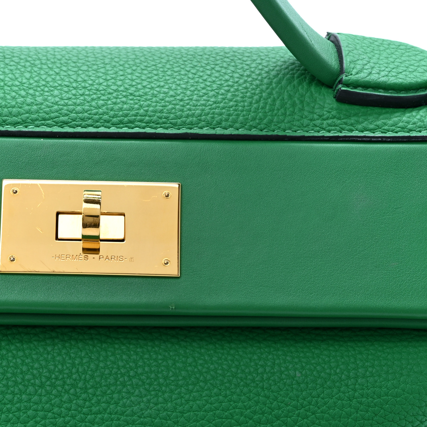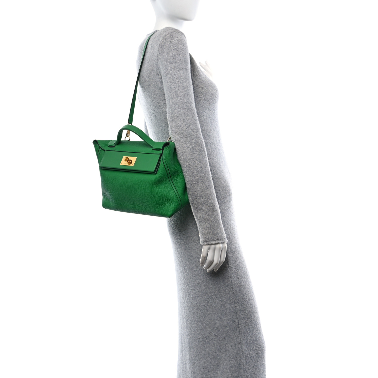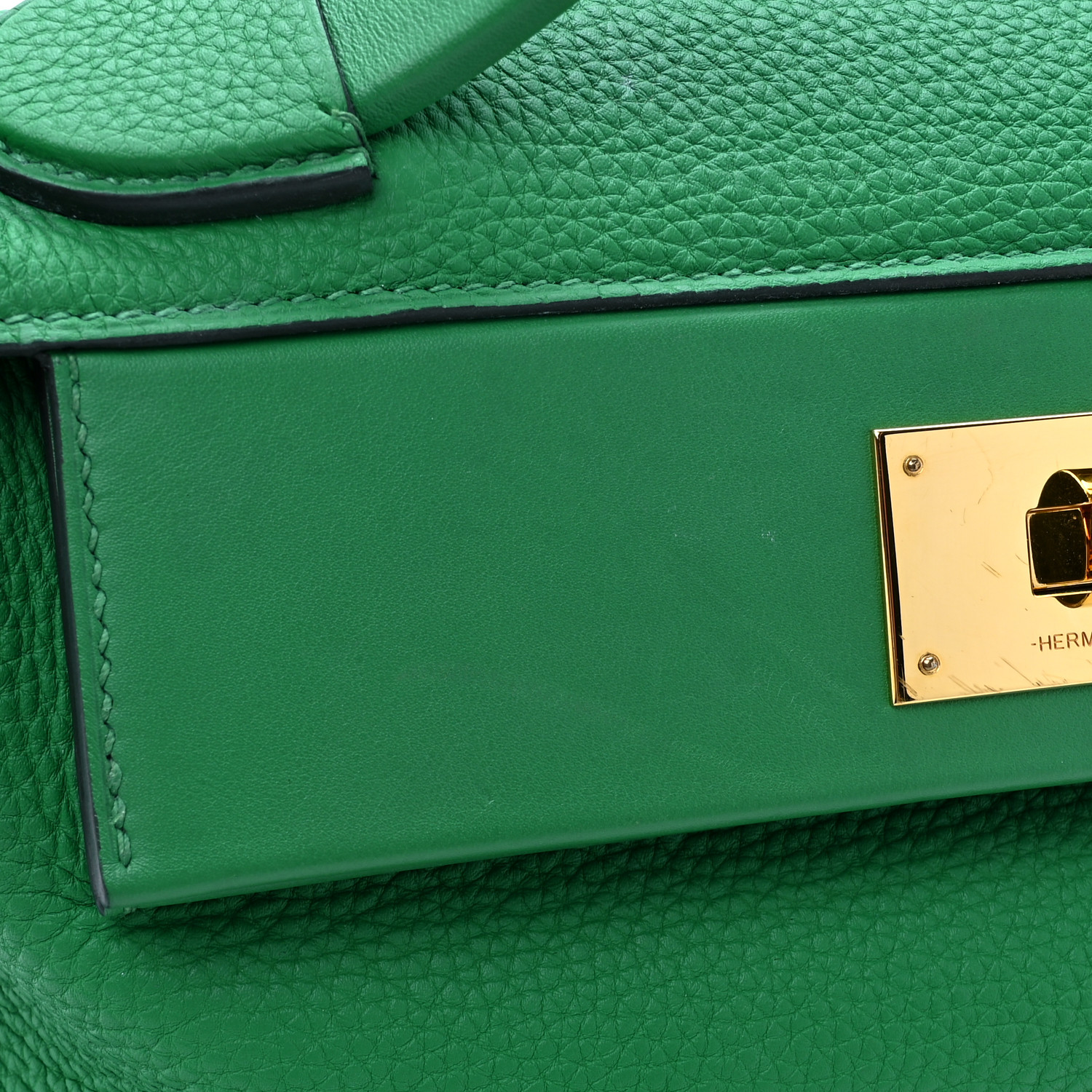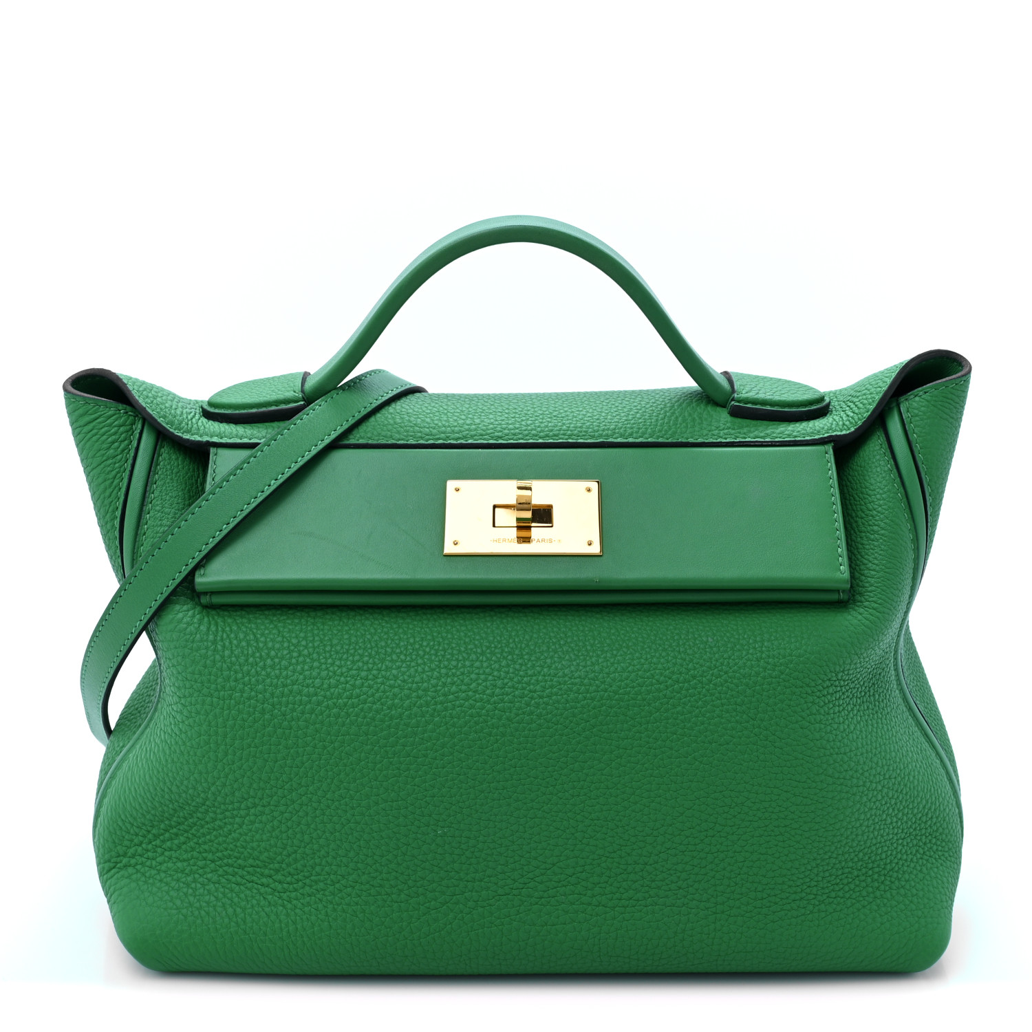 This is an authentic HERMES Togo Swift 24/24 29 in Cactus. This handbag is crafted of richly textured calfskin leather in green. The bag features a reinforced leather top handle, an optional leather shoulder strap, a rear pocket, and polished gold plated hardware. The flap opens to a leather interior with a zipper pocket.
