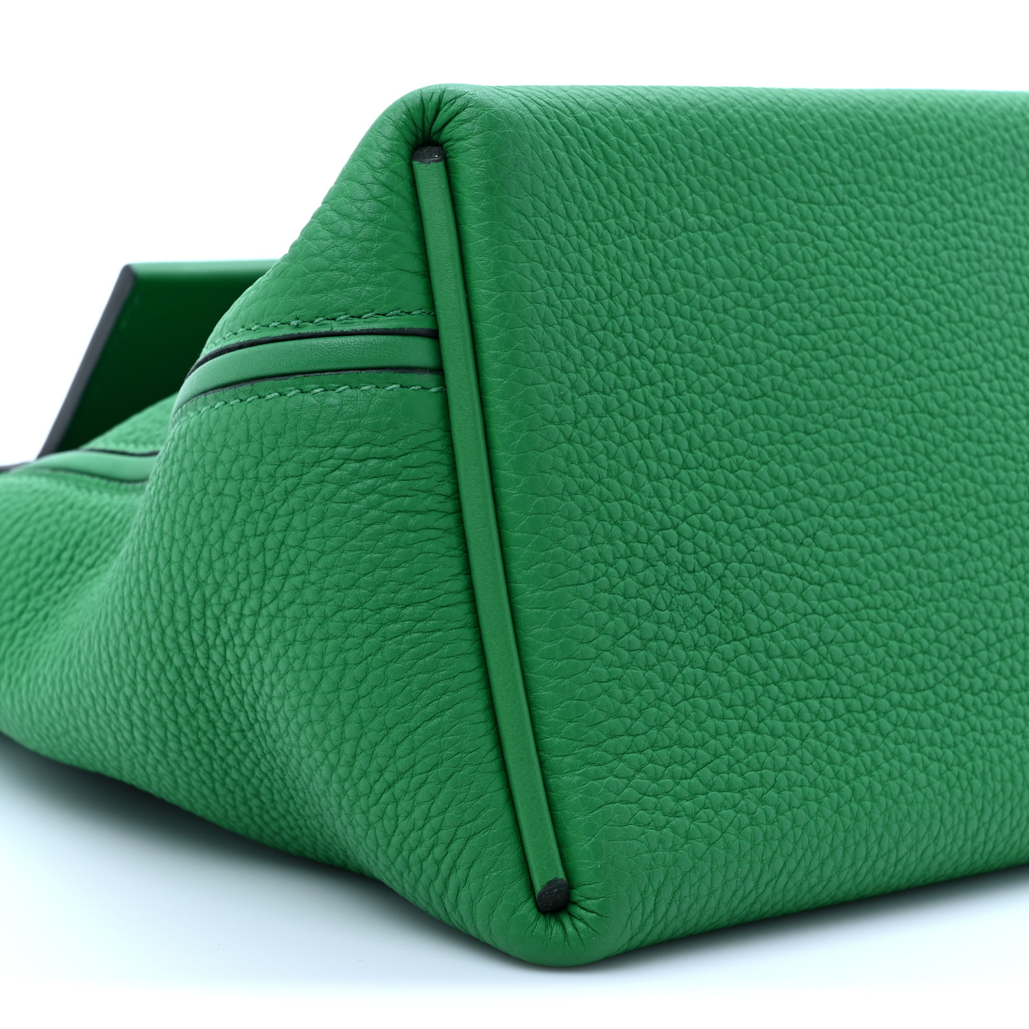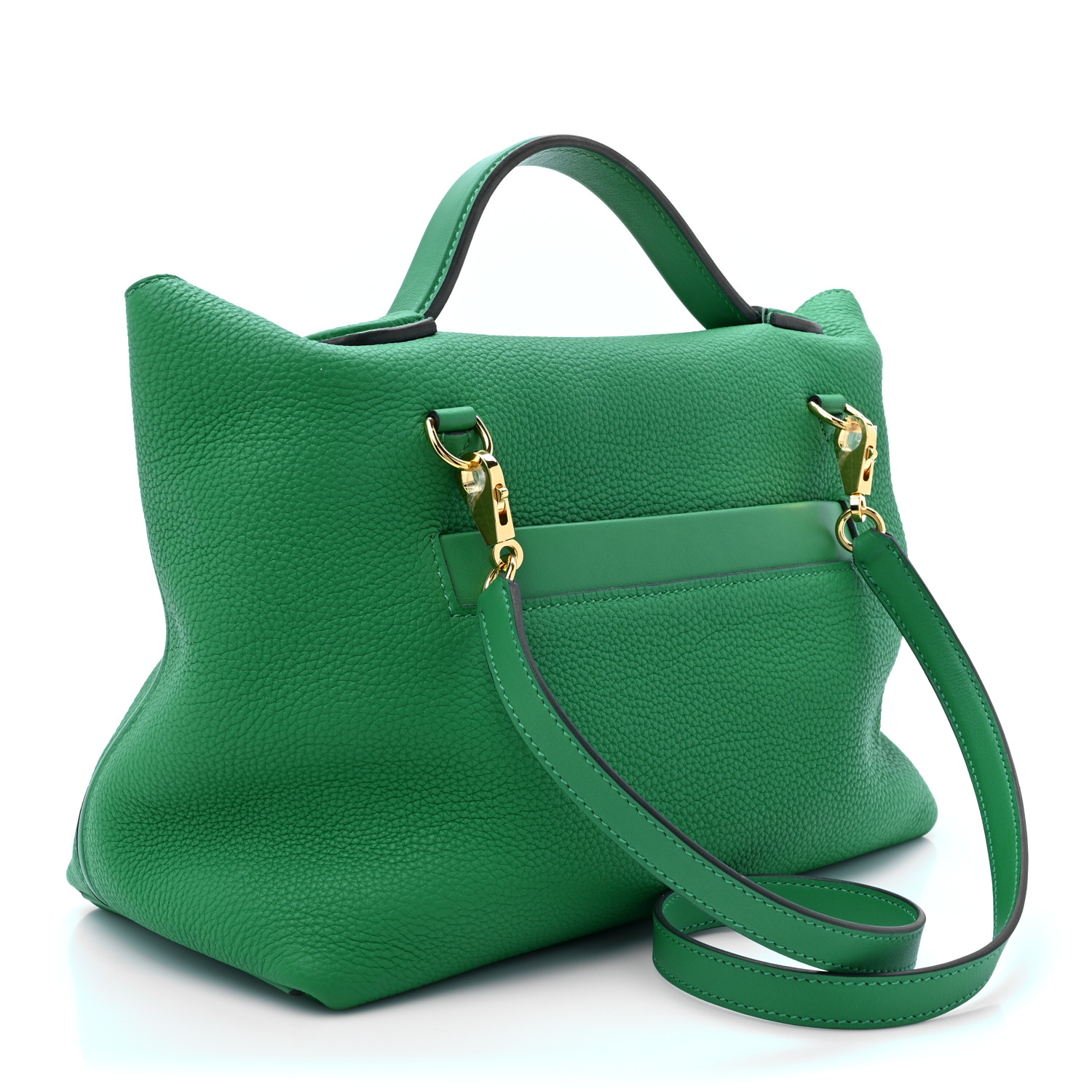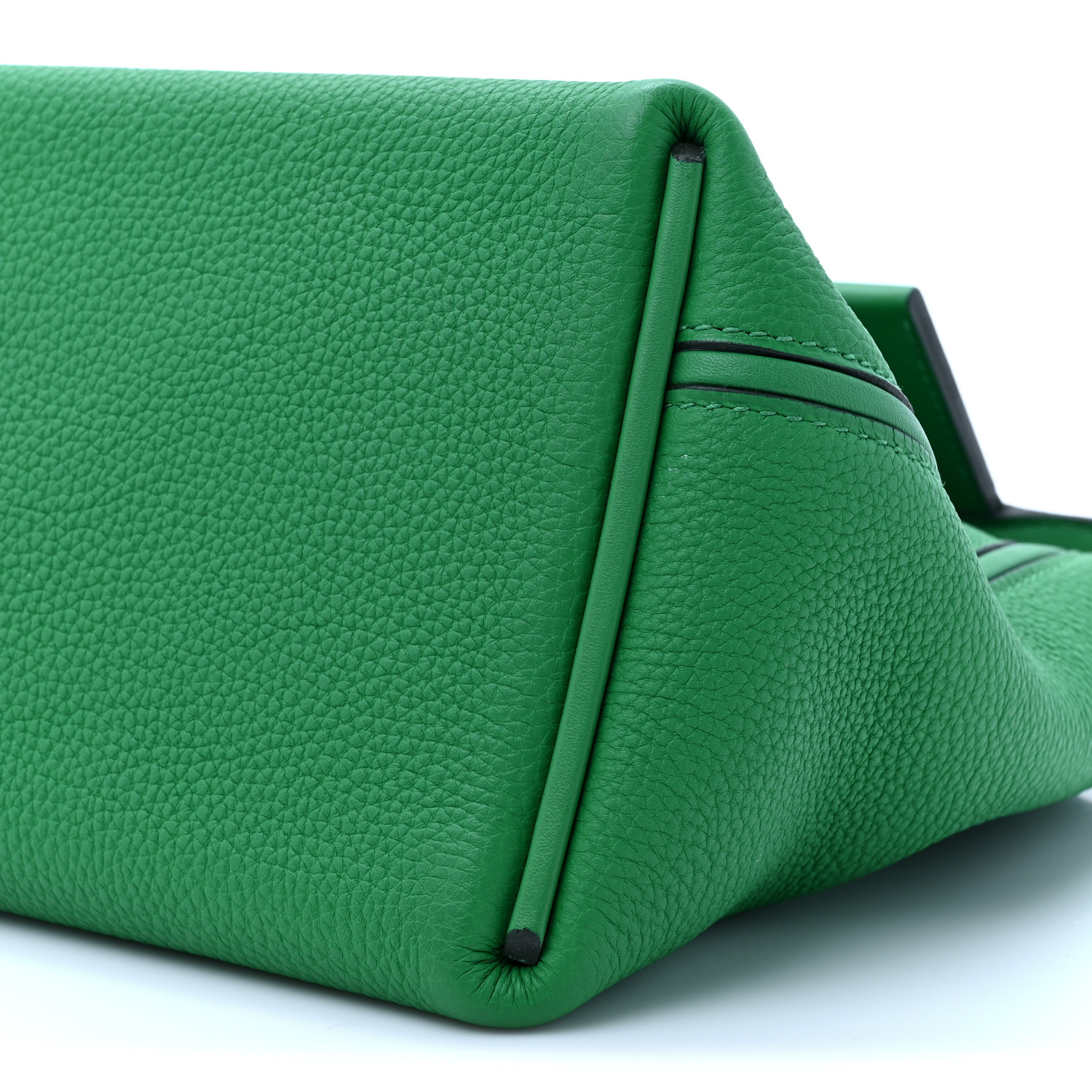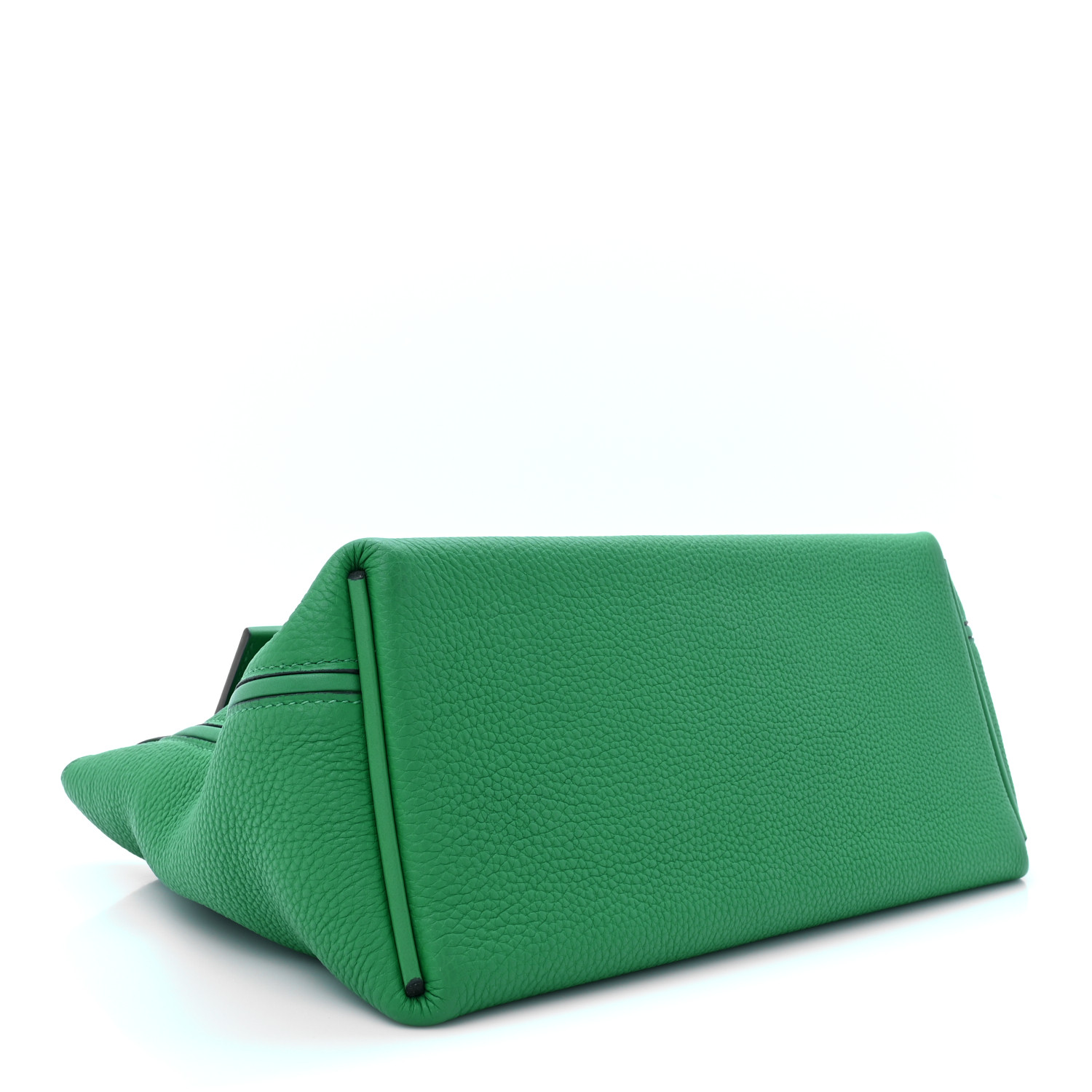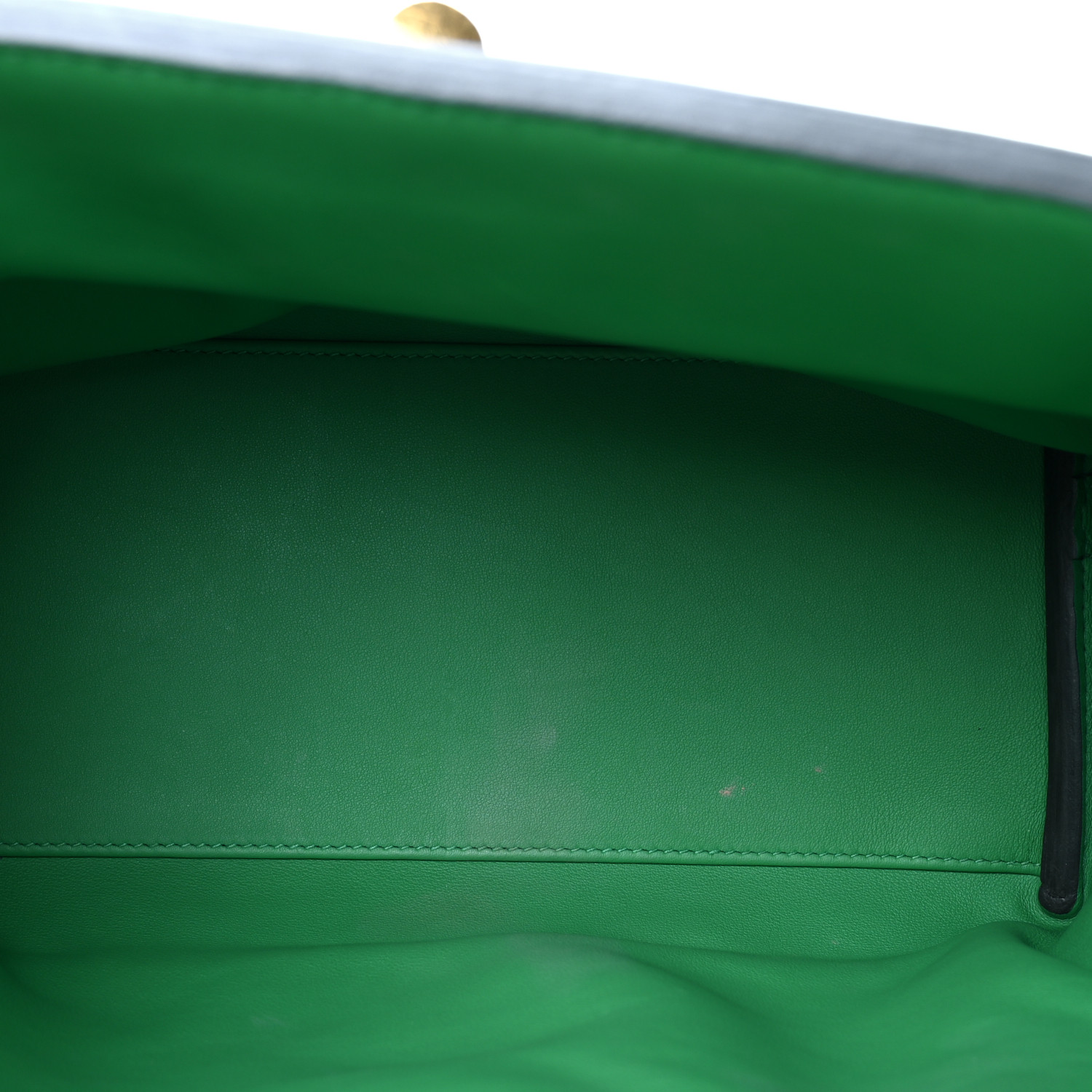 This is an authentic HERMES Togo Swift 24/24 29 in Cactus. This handbag is crafted of richly textured calfskin leather in green. The bag features a reinforced leather top handle, an optional leather shoulder strap, a rear pocket, and polished gold plated hardware. The flap opens to a leather interior with a zipper pocket.