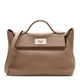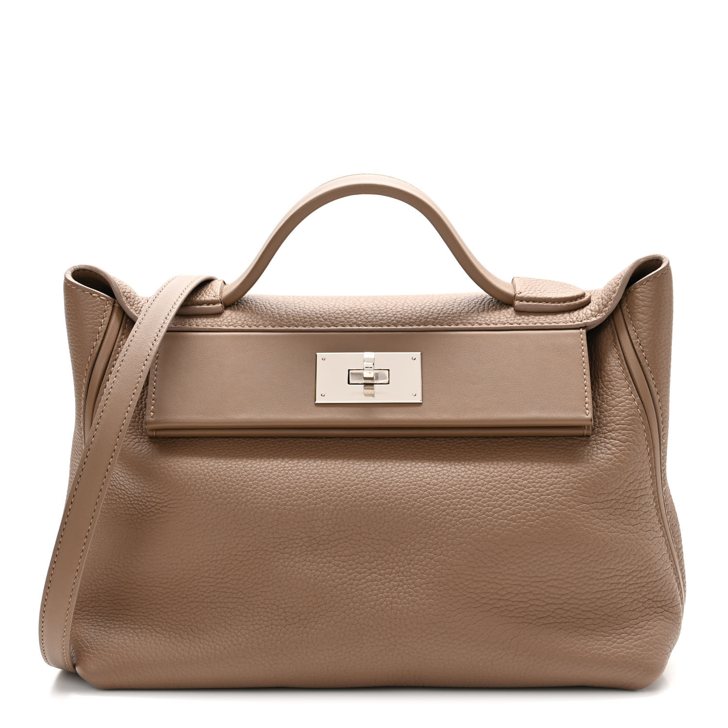 This is an authentic HERMES Togo Swift 24/24 29 in Beige De Weimar. This handbag is crafted of textured calfskin leather in taupe. The bag features a reinforced leather top handle, an optional leather shoulder strap and silver hardware including a turn lock. The flap opens to a matching leather interior with a zipper pocket.