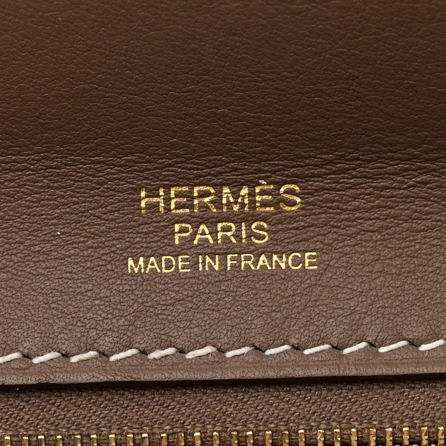 This is an authentic HERMES Togo Swift 24/24 29 in Etoupe. This handbag is crafted of textured calfskin leather in taupe. The bag features a reinforced leather top handle, an optional leather shoulder strap, gold plated hardware, and a turn lock. The flap opens to a matching leather interior with a zipper pocket.
