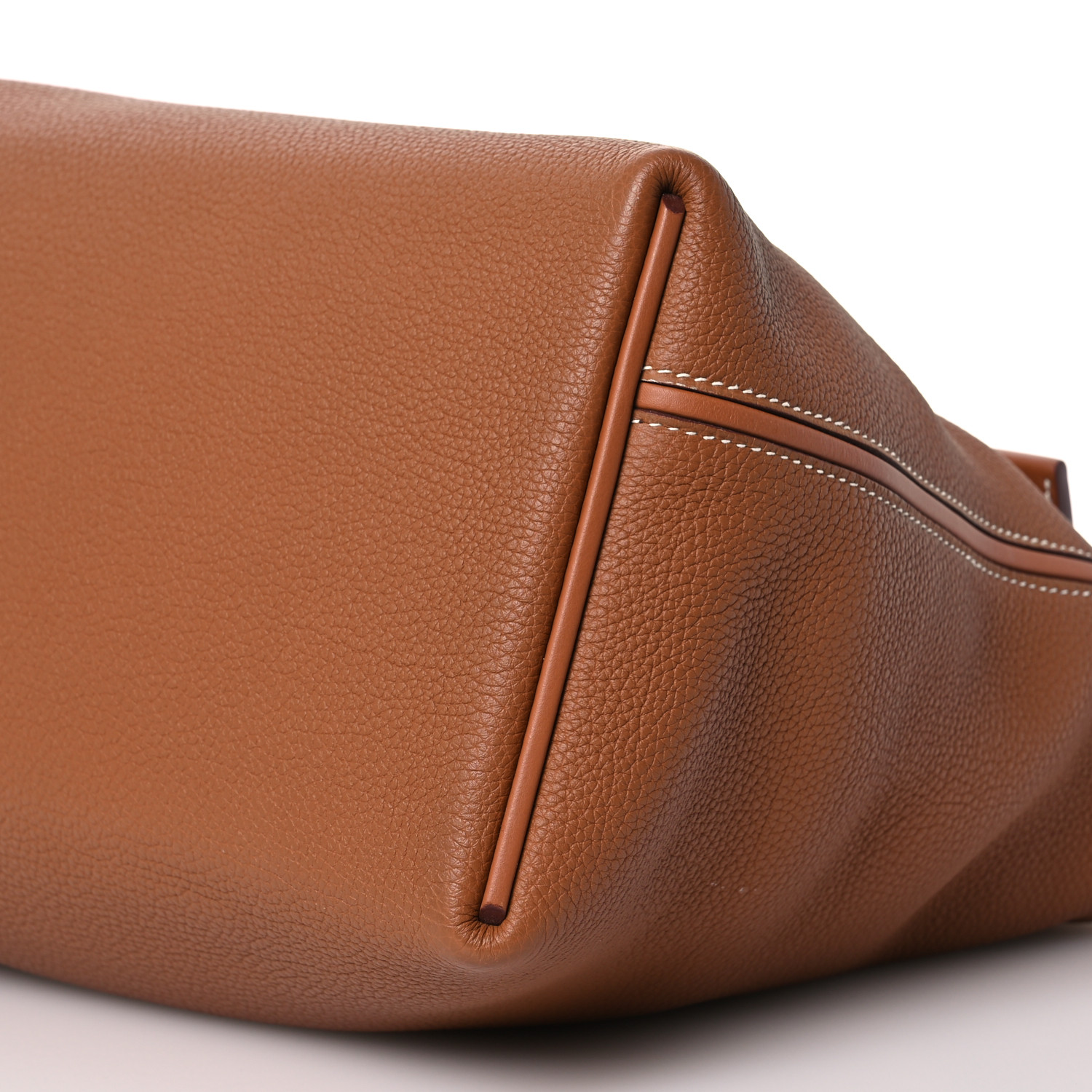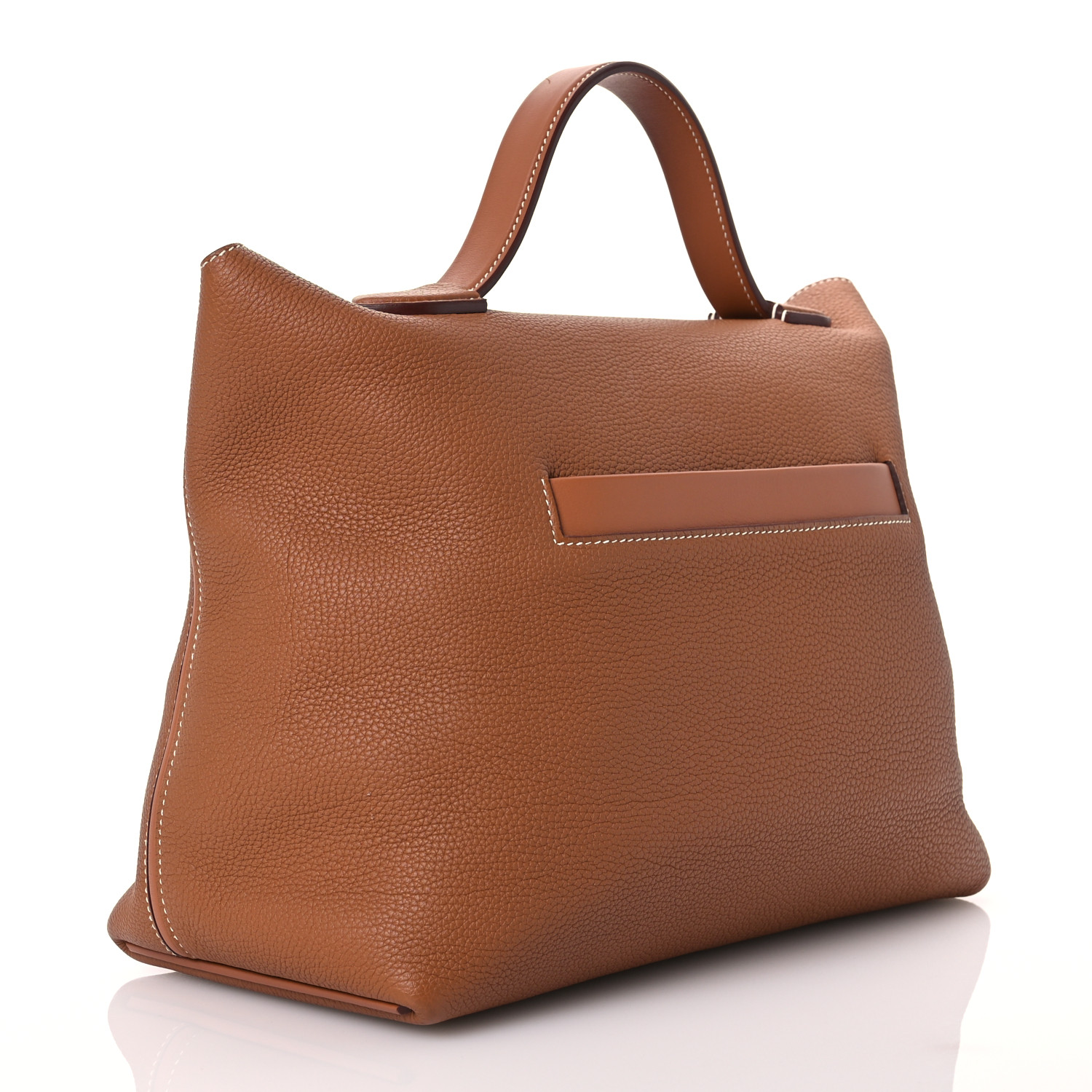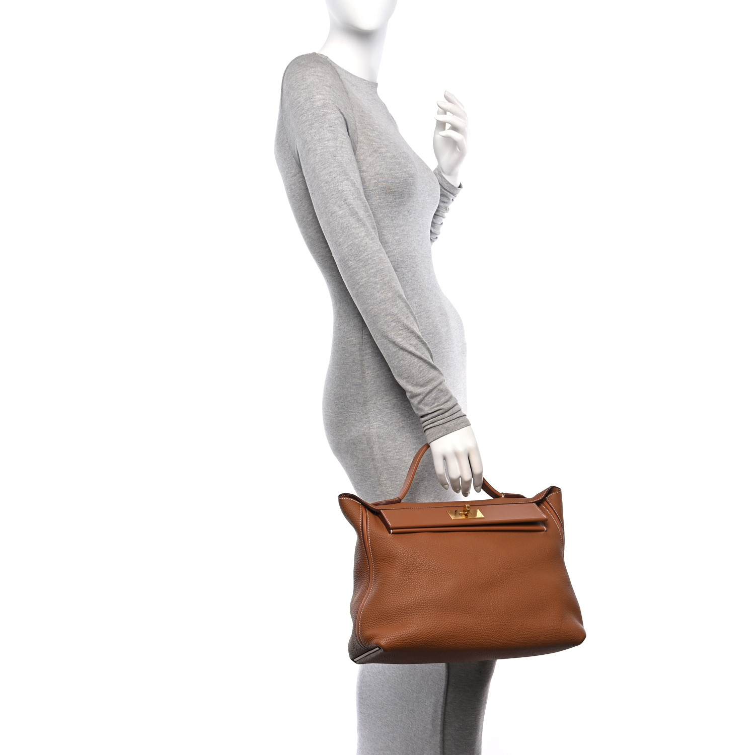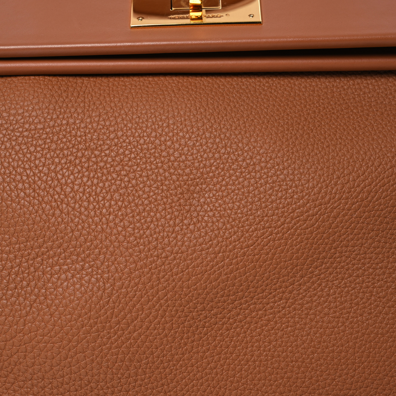 This is an authentic HERMES Togo Swift 24/24 35 in Gold. This handbag is crafted of richly textured calfskin leather in brown. The bag features a reinforced leather top handle, a rear patch pocket, and polished gold hardware. The flap opens to a smooth leather interior with a zipper pocket.