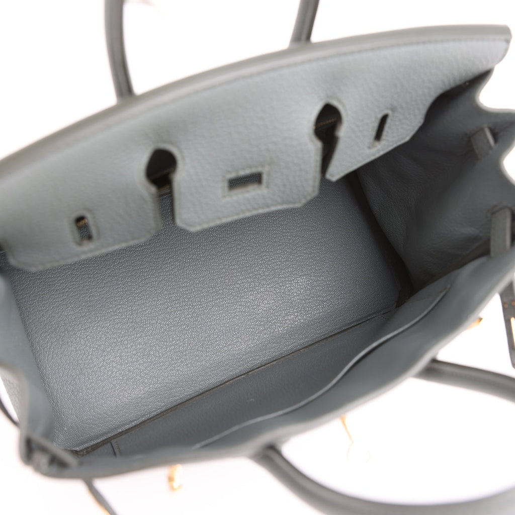 This Birkin is in Vert Amande togo leather with gold hardware, has tonal stitching, front flap, two straps with center toggle closure, clochette with lock and two keys, and double rolled handles.