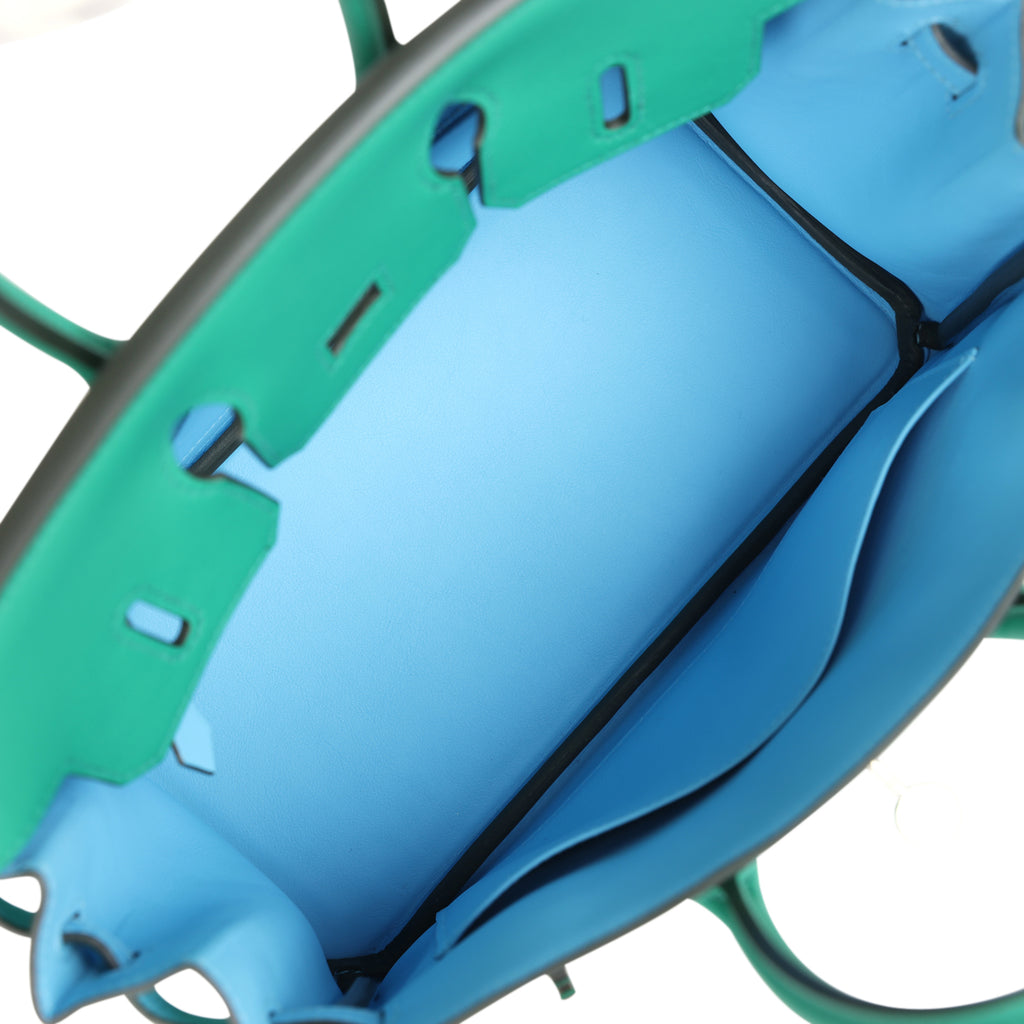 This Birkin is in Vert Vertigo and Bleu Celeste swift leather with palladium hardware and has tonal stitching, front flap, two straps with center toggle closure, clochette with lock and two keys, and double rolled handles.