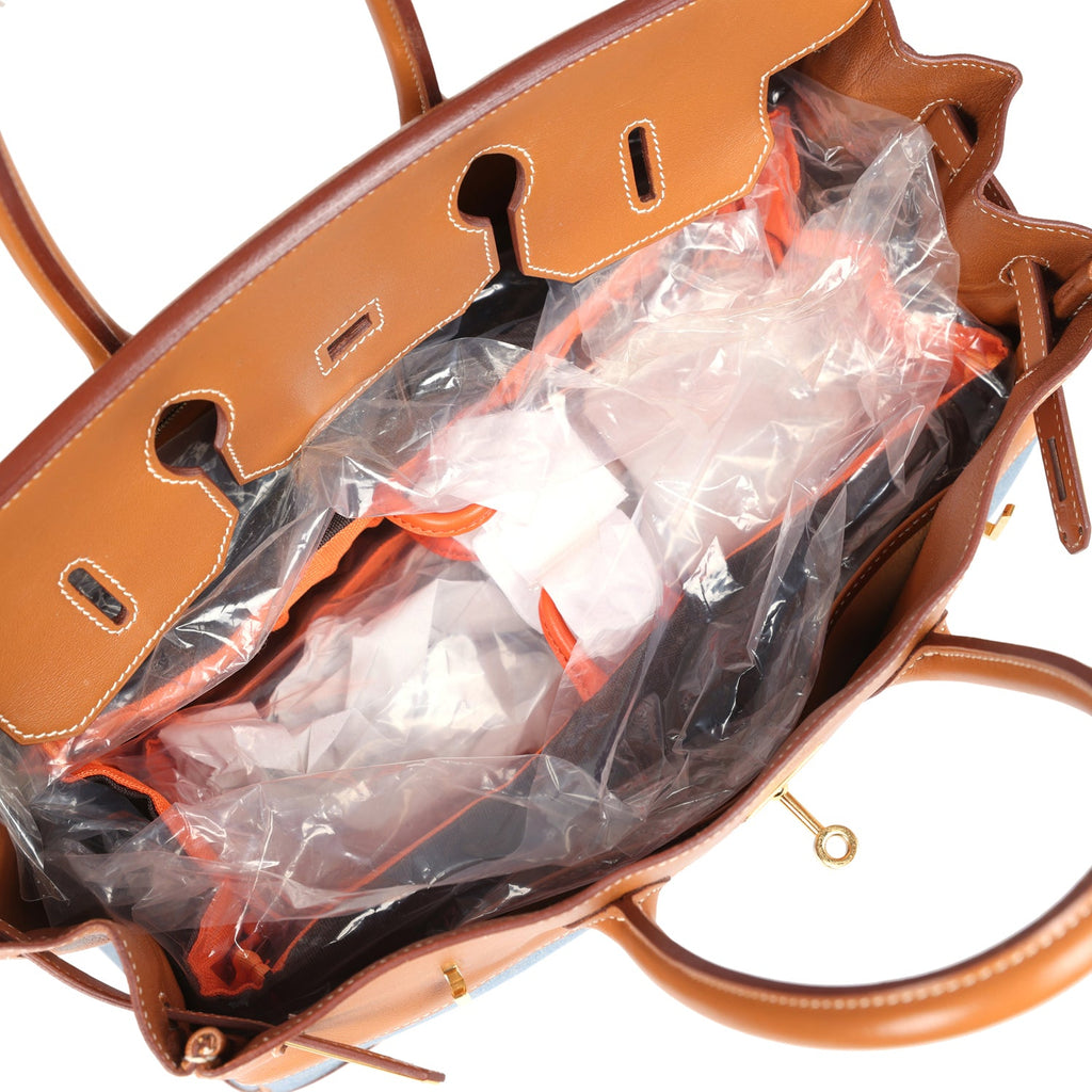 This vintage Birkin is in Blue denim and Gold Gulliver leather with gold hardware and has contrast stitching, front flap, two straps with center toggle closure, clochette with lock and two keys, and double rolled handles.
