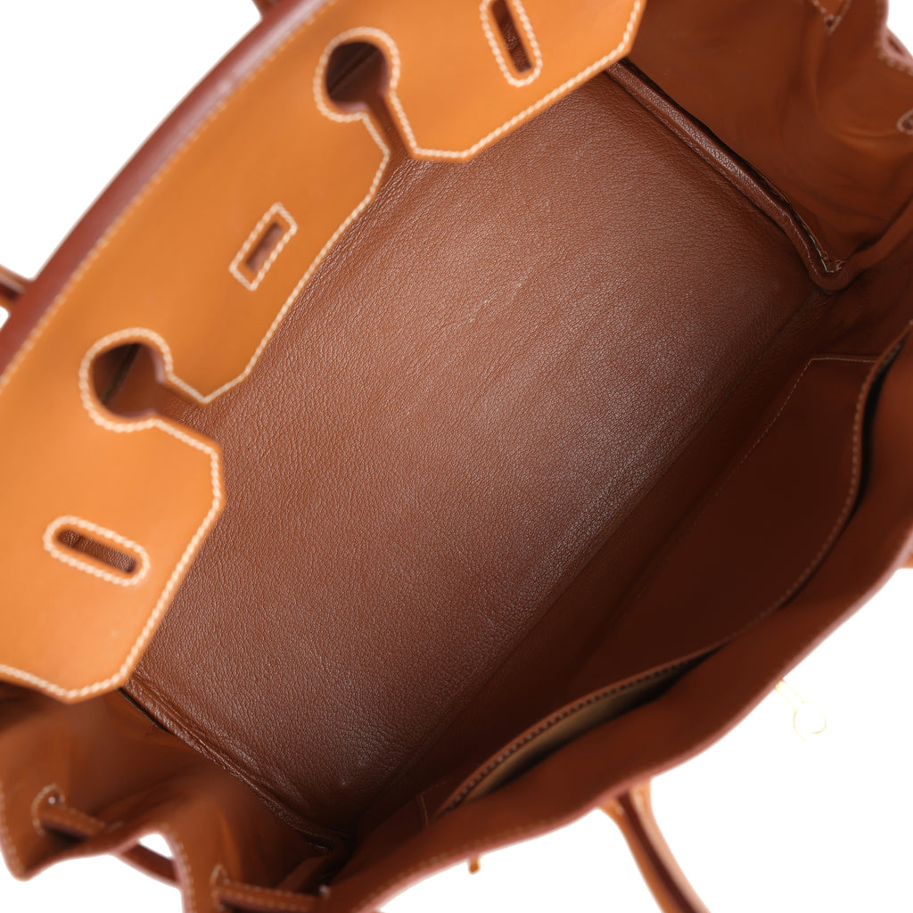The interior is lined with Gold chevre and has one zip pocket with an Hermès engraved zipper pull and an open pocket on the opposite side.