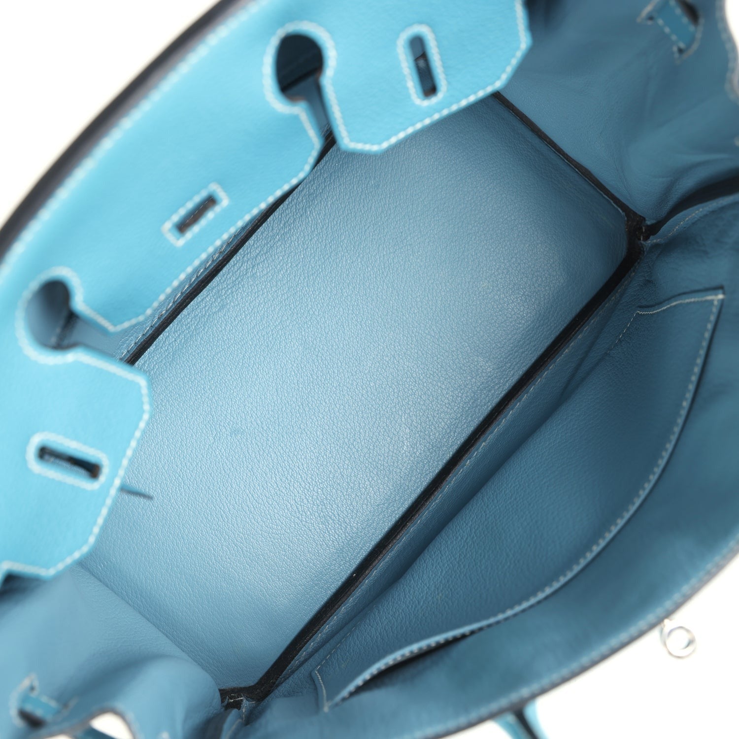 The Interior is lined in Bleu Jean chevre and has a zip pocket with Hermès engraved pull; pocket on opposite side.