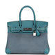 This Birkin is in Blue Jean Gulliver leather and Blue Denim with palladium hardware and has contrast stitching, two straps with front toggle closure, clochette with lock and two keys and double rolled handles.
