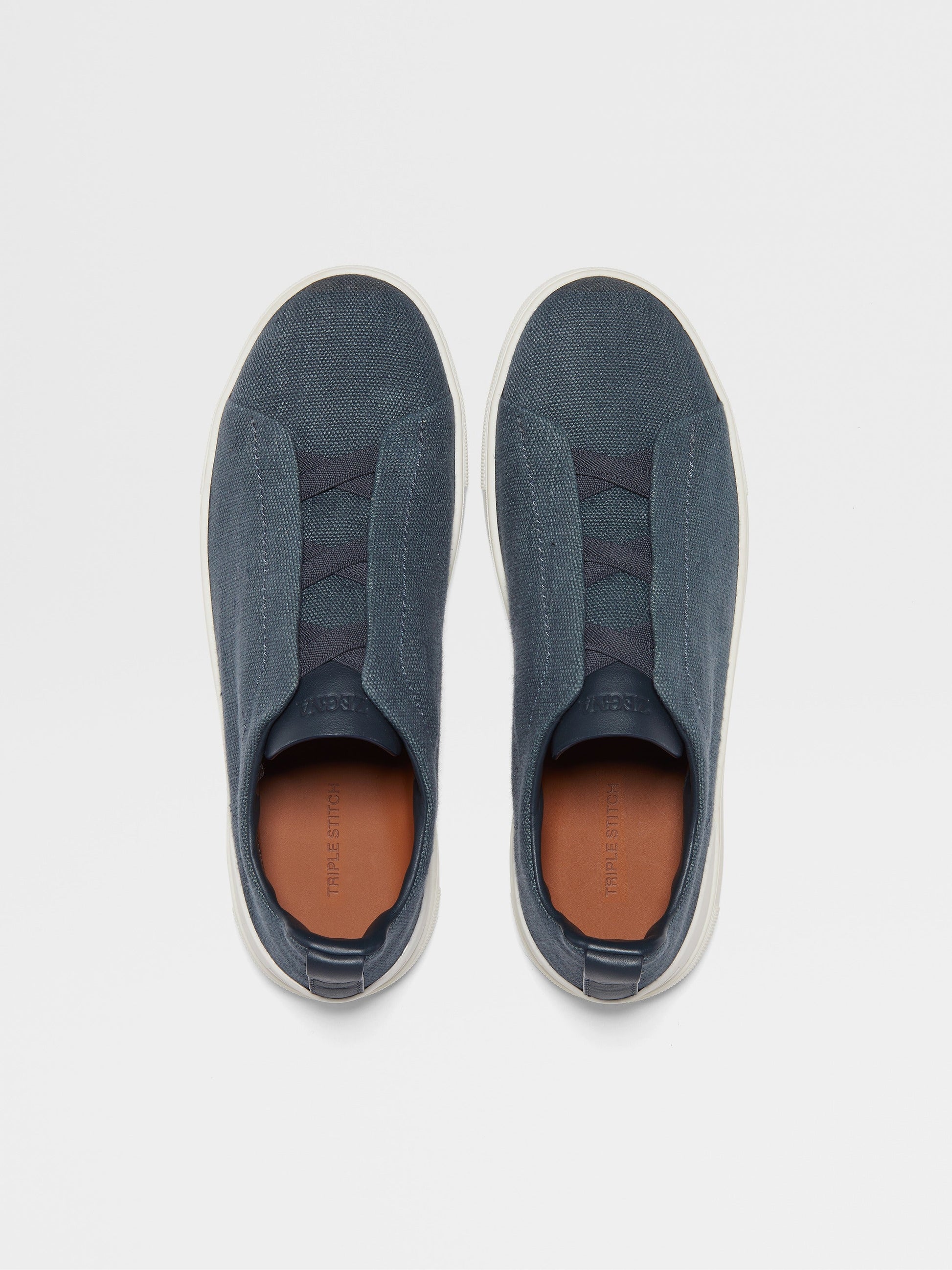 A breezy take on Zegna's emblematic shoe, these dark teal blue Triple Stitch™ sneakers are crafted from a charming cotton and linen blend. Their iconic silhouette is lined in sleek Foliage-colored leather and supported by a fresh white rubber sole, secured with the design's signature triple-crossed elastics.